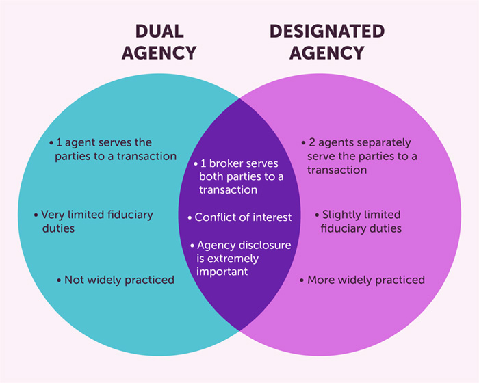 زمانی که ریلتور شما نماینده مشتریانی با منافع متضاد است و نمایندگی دوگانه مناسب نیست، آنها تعارض را به شما اطلاع داده و گزینههایی از جمله خاتمه رابطه نمایندگی با یک طرف برای نمایندگی کامل طرف دیگر، یا خاتمه رابطه نمایندگی با همه طرفین در صورتی که اطلاعاتی که درباره هر طرف دارند امکان نمایندگی عادلانه را فراهم نکند، ارائه خواهند داد.